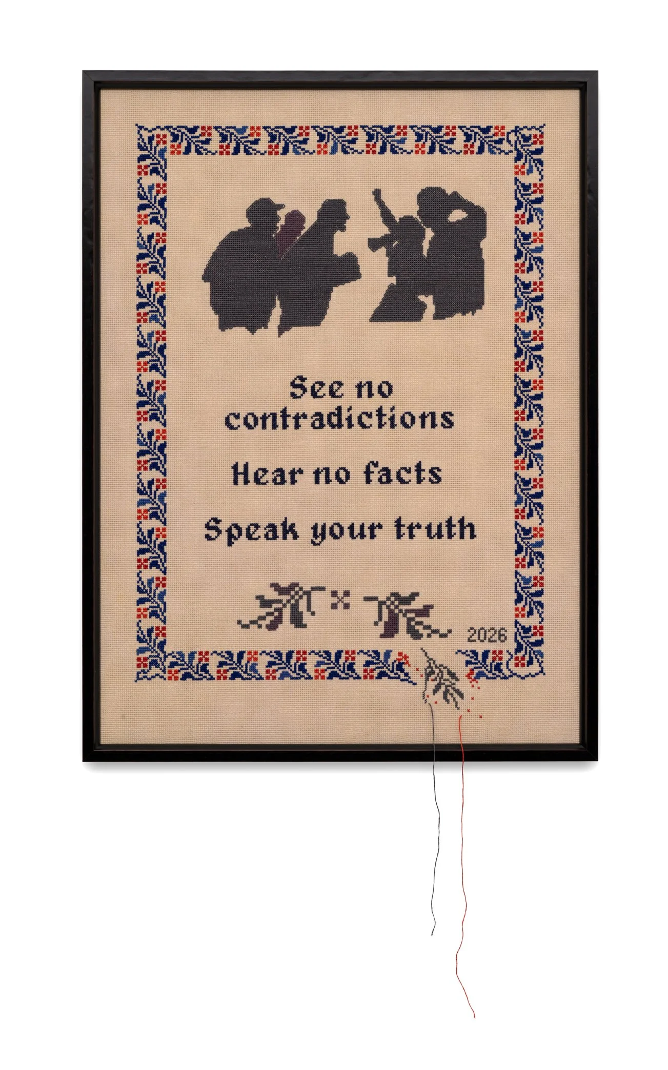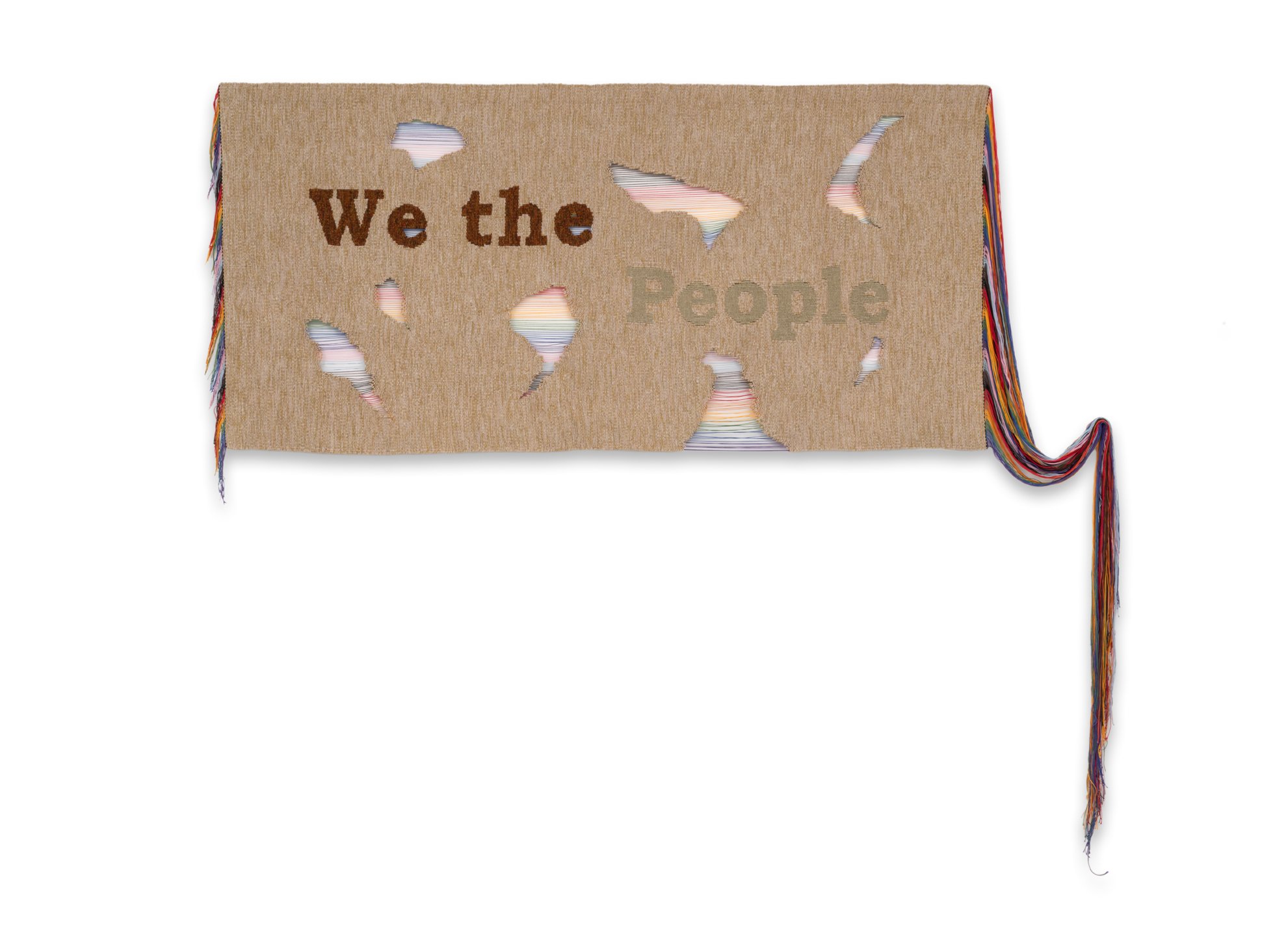 This body of work combines weaving, embroidery and text to illuminate the current fragile state of our country and our democracy. The populace suffers while political players manipulate information, sowing distortion, confusion and polarization.